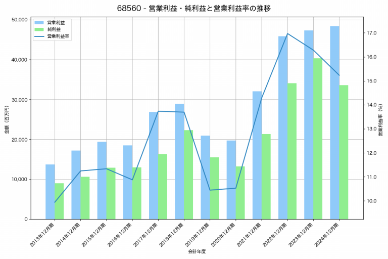 堀場製作所の2024年12月期の営業利益は48,340百万円、営業利益率は15.2%と前年比1,044百万円増、営業利益率は1.0%pt減です。