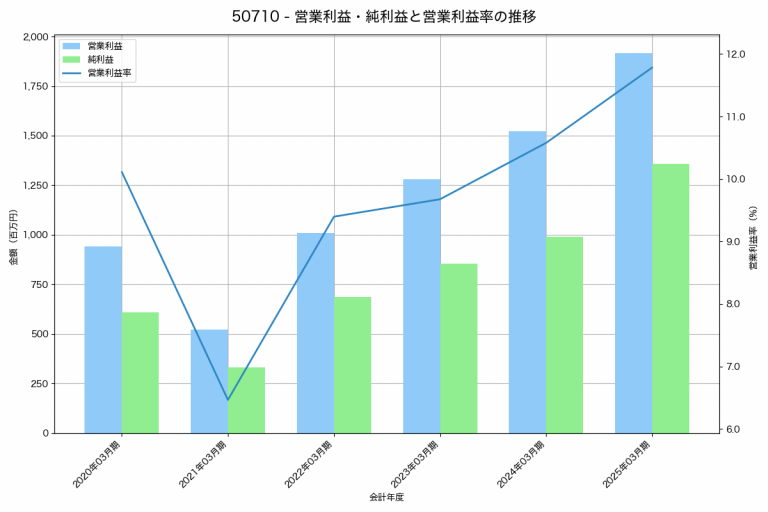 ヴィスの2025年03月期の営業利益は1,915百万円、営業利益率は11.8%と前年比392百万円増、営業利益率は1.2%pt増です。