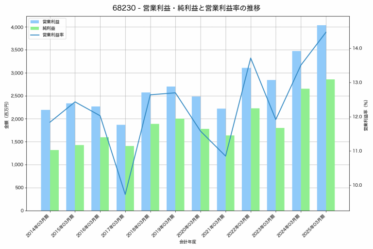 リオンの2025年03月期の営業利益は4,033百万円、営業利益率は14.5%と前年比559百万円増、営業利益率は1.0%pt増です。