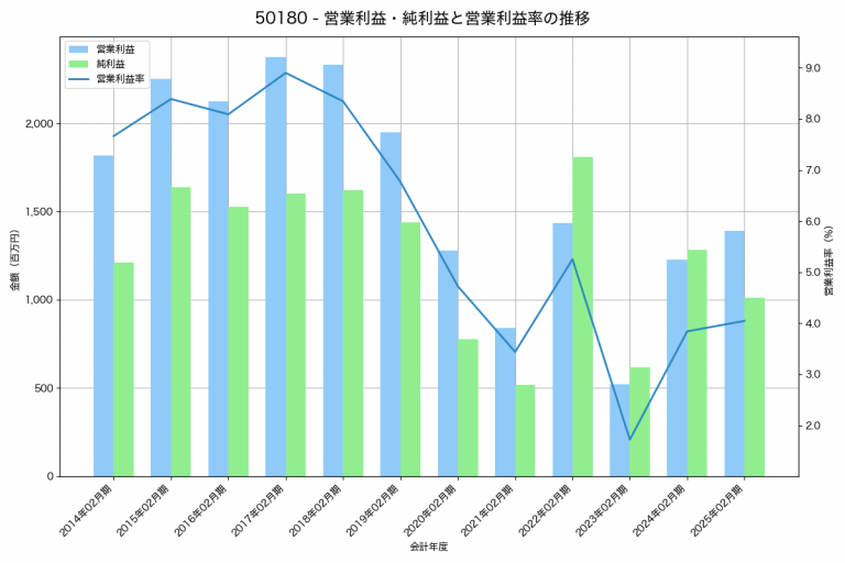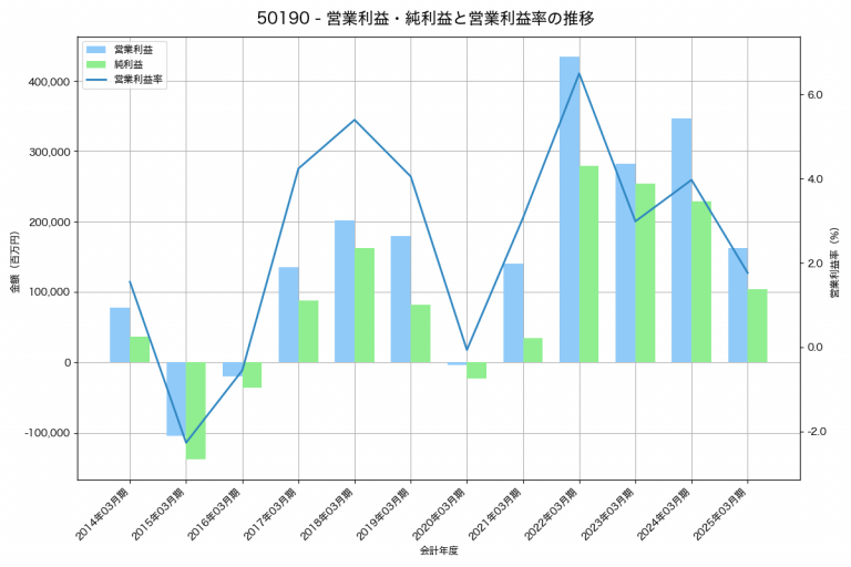 出光興産の2025年03月期の営業利益は162,185百万円、営業利益率は1.8%と前年比184,131百万円減、営業利益率は2.2%pt減です。