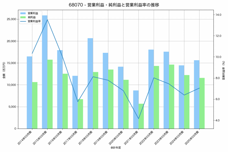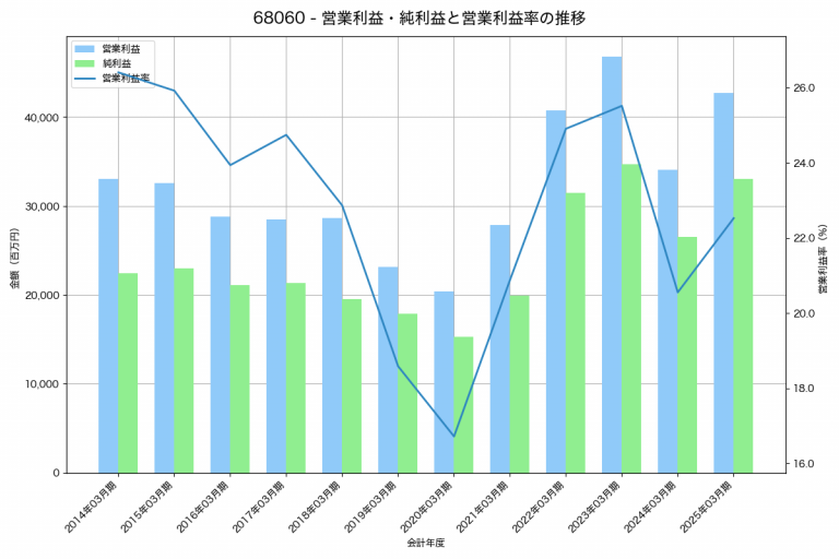 ヒロセ電機の2025年03月期の営業利益は42,672百万円、営業利益率は22.5%と前年比8,655百万円増、営業利益率は2.0%pt増です。