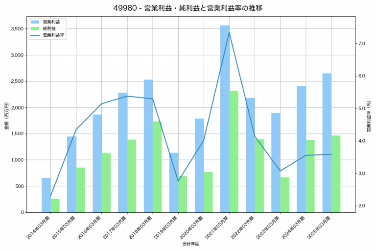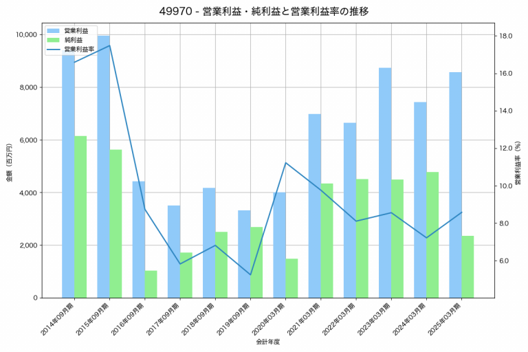 日本農薬の2025年03月期の営業利益は8,576百万円、営業利益率は8.6%と前年比1,138百万円増、営業利益率は1.4%pt増です。