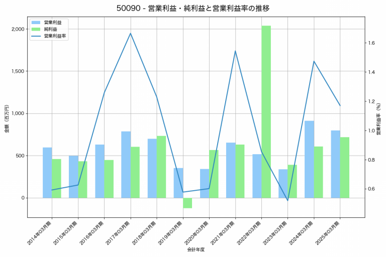 富士興産の2025年03月期の営業利益は800百万円、営業利益率は1.2%と前年比113百万円減、営業利益率は0.3%pt減です。