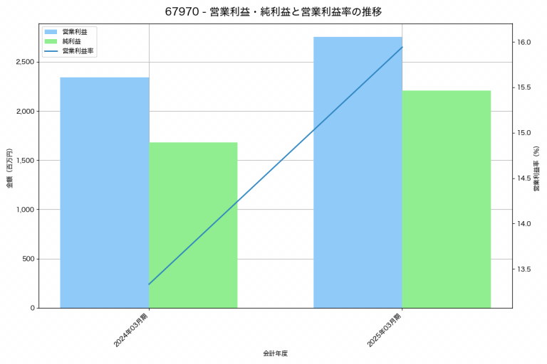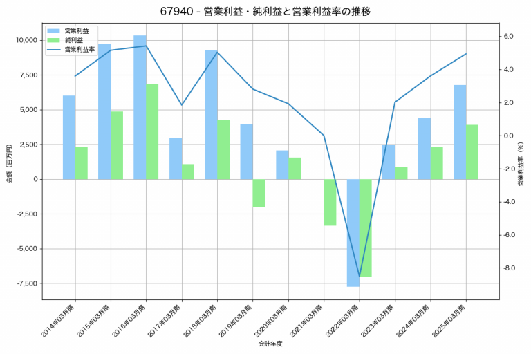 フォスター電機の2025年03月期の営業利益は6,796百万円、営業利益率は4.9%と前年比2,384百万円増、営業利益率は1.3%pt増です。