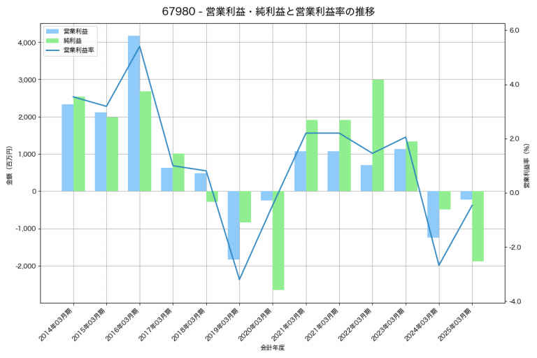 SMKの2025年03月期の営業利益は-220百万円、営業利益率は-0.5%と前年比1,023百万円増、営業利益率は2.2%pt増です。
