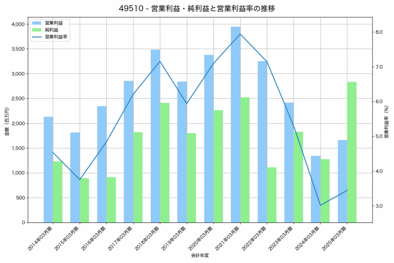 コニシの2025年03月期の営業利益は10,649百万円、営業利益率は7.8%と前年比363百万円増、営業利益率は0.1%pt増です。