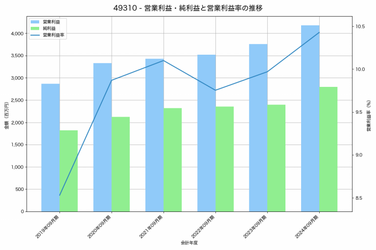 新日本製薬の2024年09月期の営業利益は4,176百万円、営業利益率は10.4%と前年比422百万円増、営業利益率は0.5%pt増です。