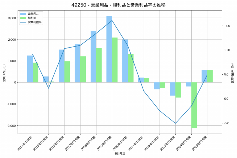 ハーバー研究所の2025年03月期の営業利益は589百万円、営業利益率は4.9%と前年比776百万円増、営業利益率は6.4%pt増です。