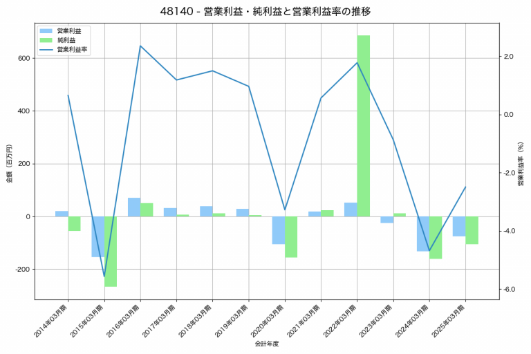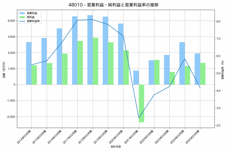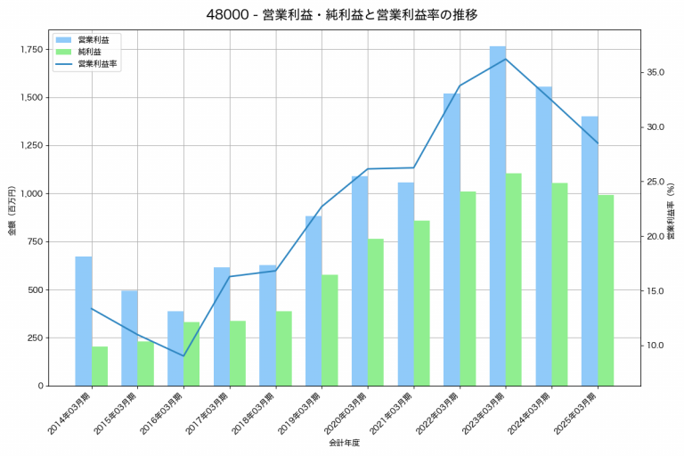 オリコンの2025年03月期の営業利益は1,402百万円、営業利益率は28.5%と前年比154百万円減、営業利益率は3.9%pt減です。