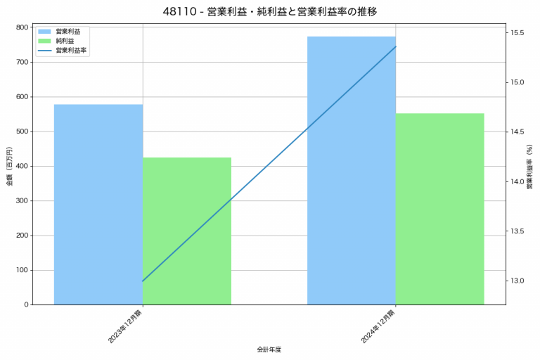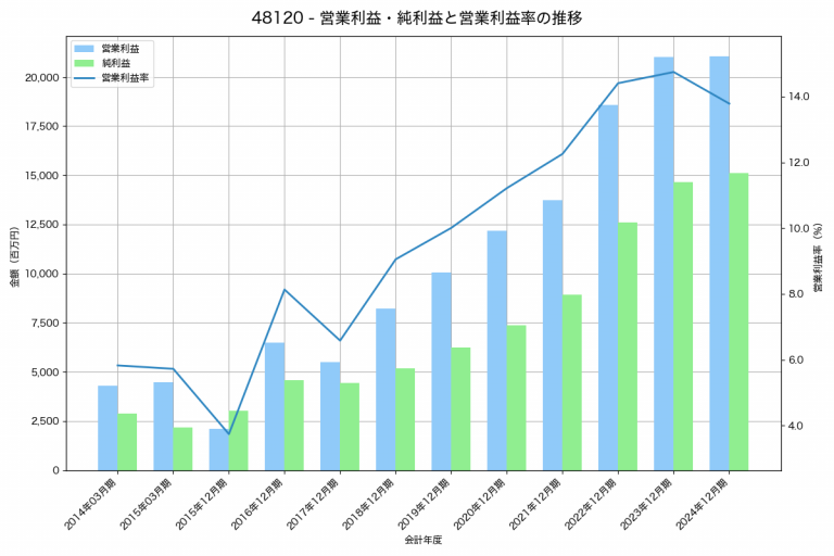 電通総研の2024年12月期の営業利益は21,039百万円、営業利益率は13.8%と前年比11百万円増、営業利益率は1.0%pt減です。