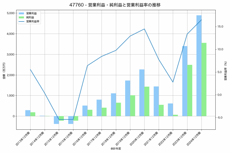 サイボウズの2024年12月期の営業利益は4,892百万円、営業利益率は16.5%と前年比1,498百万円増、営業利益率は3.1%pt増です。