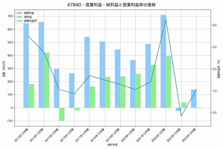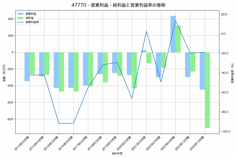 ガーラの2024年12月期の営業利益は-447百万円、営業利益率は-19.0%と前年比151百万円減、営業利益率は0.8%pt増です。