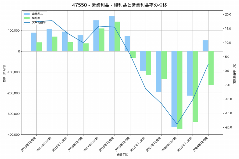 楽天グループの2024年12月期の営業利益は52,975百万円、営業利益率は2.3%と前年比265,832百万円増、営業利益率は12.6%pt増です。