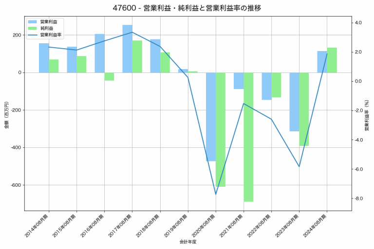 アルファの2024年08月期の営業利益は114百万円、営業利益率は1.9%と前年比428百万円増、営業利益率は7.7%pt増です。