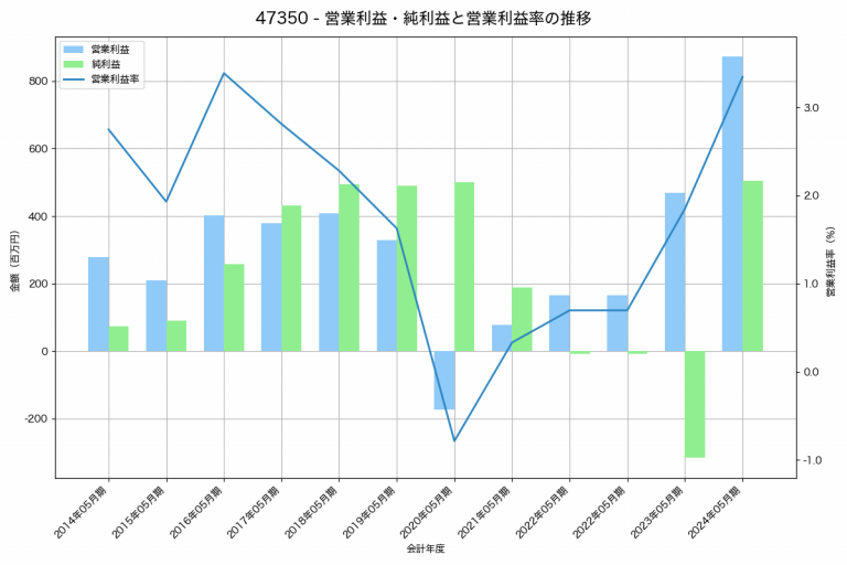 京進の2024年05月期の営業利益は873百万円、営業利益率は3.3%と前年比403百万円増、営業利益率は1.5%pt増です。