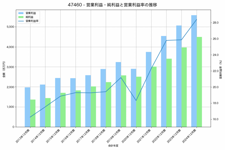 東計電算の2024年12月期の営業利益は5,576百万円、営業利益率は28.4%と前年比516百万円増、営業利益率は2.5%pt増です。