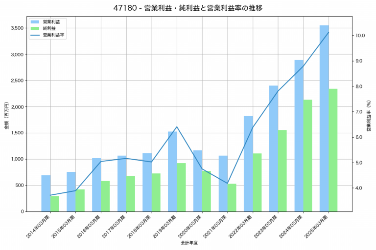 早稲田アカデミーの2025年03月期の営業利益は3,549百万円、営業利益率は10.1%と前年比660百万円増、営業利益率は1.3%pt増です。