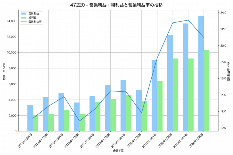 フューチャーの2024年12月期の営業利益は14,667百万円、営業利益率は21.0%と前年比967百万円増、営業利益率は2.1%pt減です。