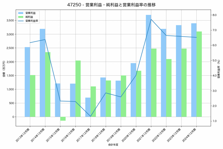 CAC Holdingsの2024年12月期の営業利益は3,394百万円、営業利益率は6.5%と前年比67百万円増、営業利益率は0.1%pt減です。