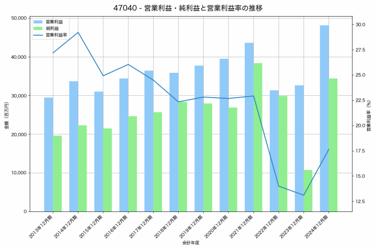 トレンドマイクロの2024年12月期の営業利益は48,105百万円、営業利益率は17.6%と前年比15,503百万円増、営業利益率は4.5%pt増です。