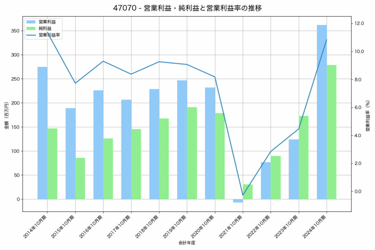 キタックの2024年10月期の営業利益は362百万円、営業利益率は10.8%と前年比238百万円増、営業利益率は6.4%pt増です。