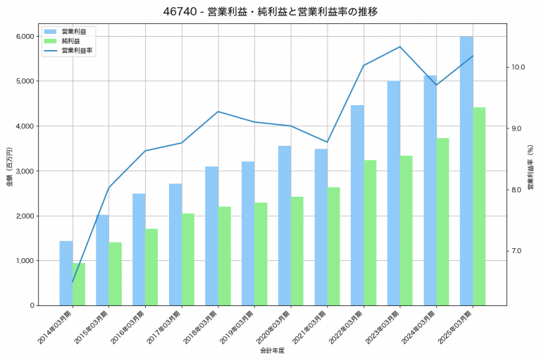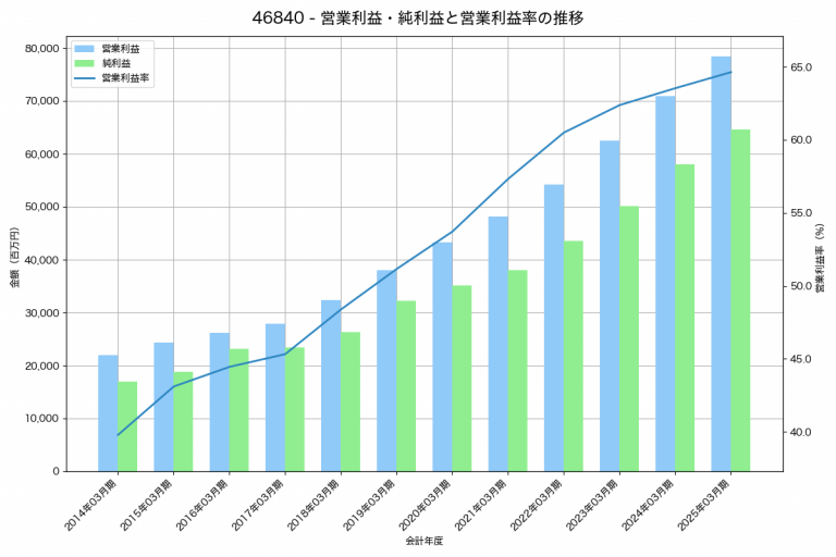 オービックの2025年03月期の営業利益は78,378百万円、営業利益率は64.6%と前年比7,468百万円増、営業利益率は1.1%pt増です。