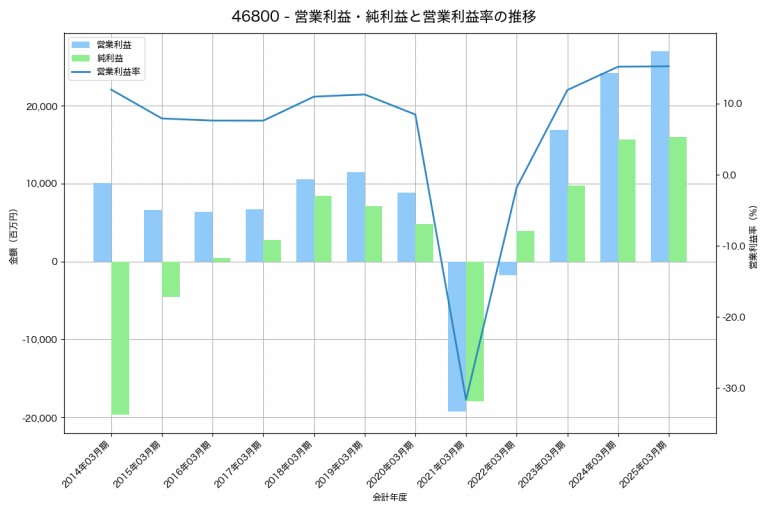 ラウンドワンの2025年03月期の営業利益は27,006百万円、営業利益率は15.3%と前年比2,811百万円増、営業利益率は0.1%pt増です。