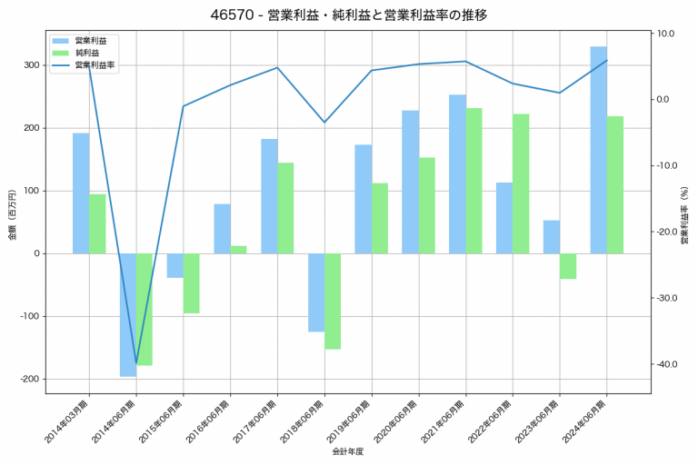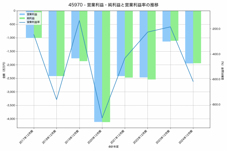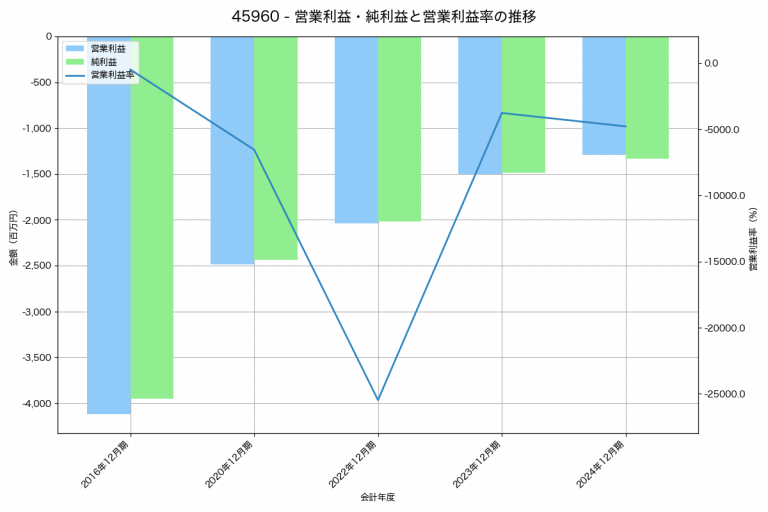 ソレイジア・ファーマの2024年12月期の営業利益は-1,951百万円、営業利益率は-617.4%と前年比812百万円減、営業利益率は432.8%pt減です。
