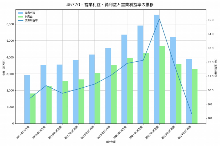 ダイトの2024年05月期の営業利益は3,894百万円、営業利益率は8.3%と前年比1,313百万円減、営業利益率は3.2%pt減です。