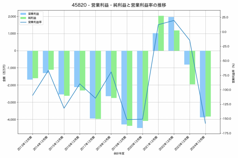 シンバイオ製薬の2024年12月期の営業利益は-3,876百万円、営業利益率は-158.1%と前年比3,065百万円減、営業利益率は143.6%pt減です。