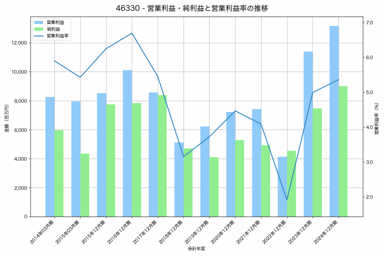 サカタインクスの2024年12月期の営業利益は13,161百万円、営業利益率は5.4%と前年比1,763百万円増、営業利益率は0.4%pt増です。