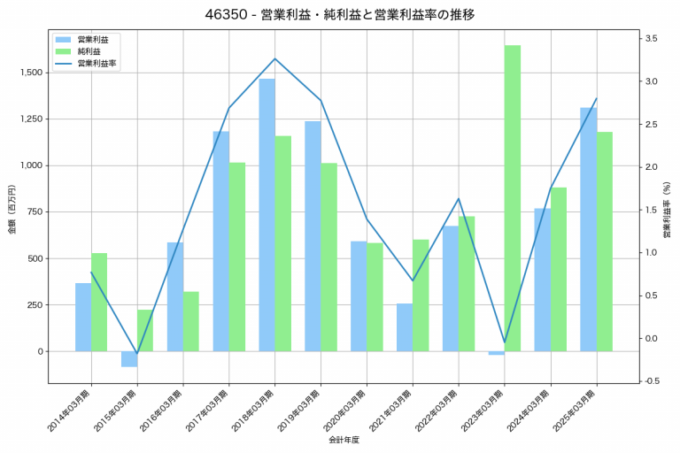東京インキの2025年03月期の営業利益は1,309百万円、営業利益率は2.8%と前年比541百万円増、営業利益率は1.0%pt増です。