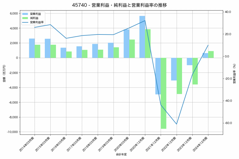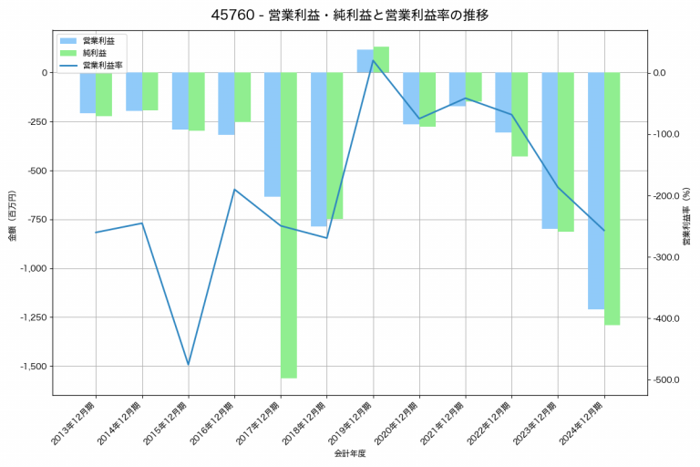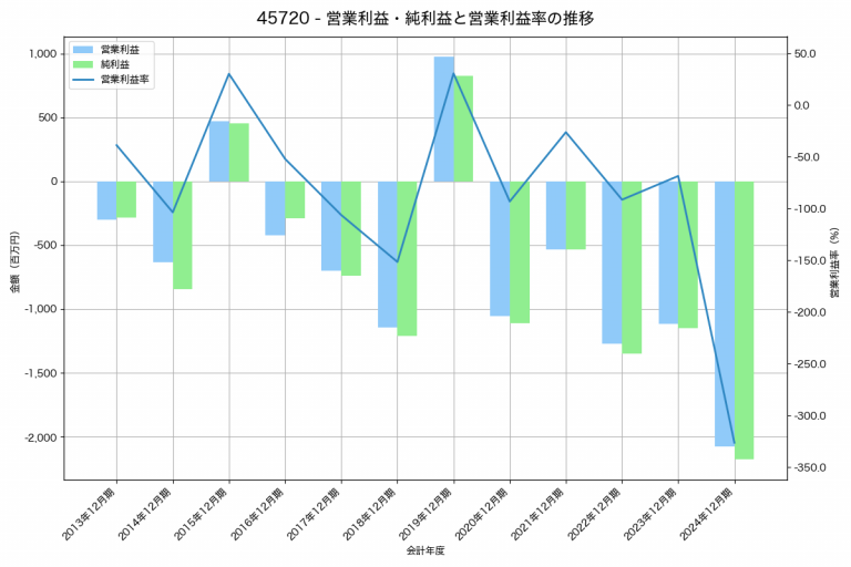 カルナバイオサイエンスの2024年12月期の営業利益は-2,076百万円、営業利益率は-326.4%と前年比960百万円減、営業利益率は257.7%pt減です。