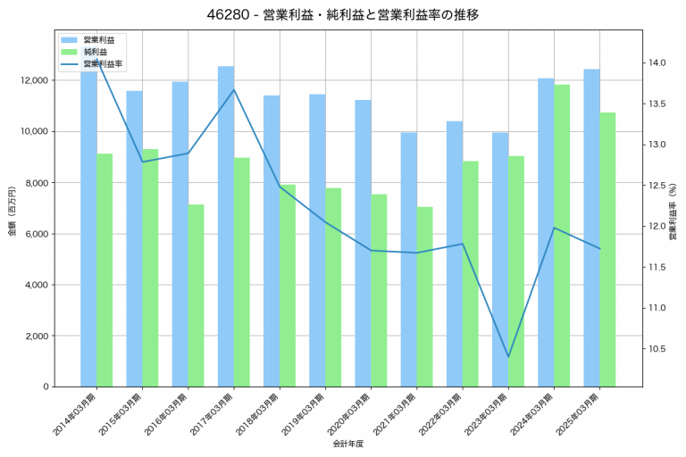 エスケー化研の2025年03月期の営業利益は12,444百万円、営業利益率は11.7%と前年比359百万円増、営業利益率は0.3%pt減です。