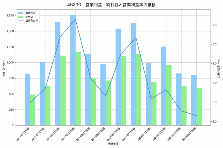 大伸化学の2025年03月期の営業利益は799百万円、営業利益率は2.3%と前年比26百万円減、営業利益率は0.2%pt減です。