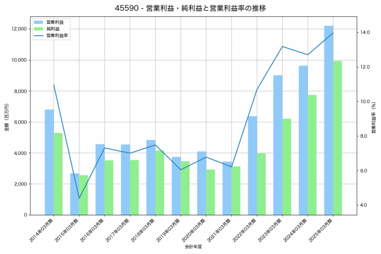 ゼリア新薬工業の2025年03月期の営業利益は12,197百万円、営業利益率は14.0%と前年比2,576百万円増、営業利益率は1.3%pt増です。