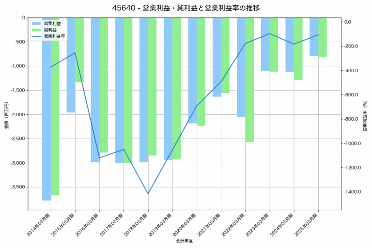 オンコセラピー・サイエンスの2025年03月期の営業利益は-797百万円、営業利益率は-106.3%と前年比323百万円増、営業利益率は77.3%pt増です。