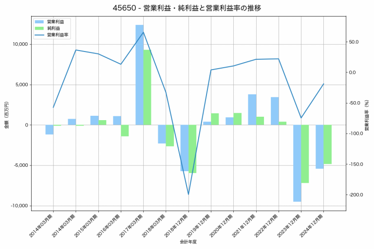 ネクセラファーマの2024年12月期の営業利益は-5,423百万円、営業利益率は-18.8%と前年比4,103百万円増、営業利益率は55.8%pt増です。