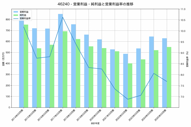 イサム塗料の2025年03月期の営業利益は628百万円、営業利益率は7.7%と前年比17百万円減、営業利益率は0.4%pt減です。