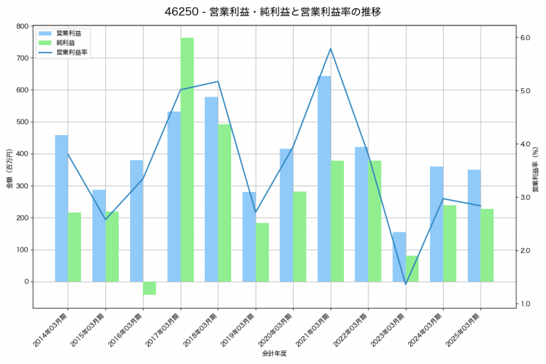 アトミクスの2025年03月期の営業利益は350百万円、営業利益率は2.8%と前年比10百万円減、営業利益率は0.1%pt減です。