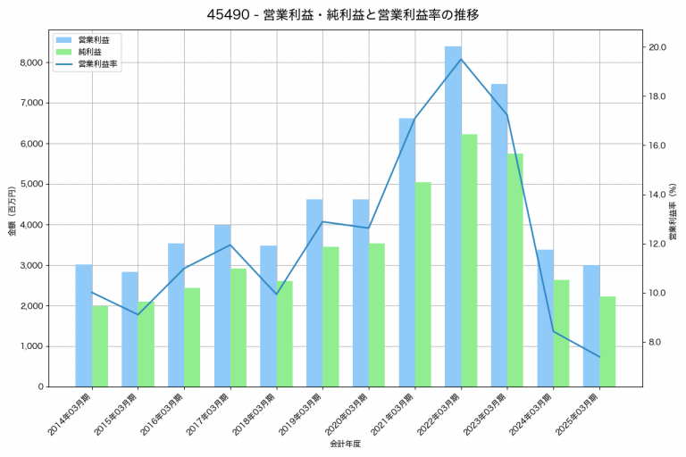 栄研化学の2025年03月期の営業利益は2,999百万円、営業利益率は7.4%と前年比378百万円減、営業利益率は1.0%pt減です。