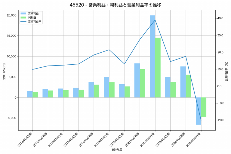 JCRファーマの2025年03月期の営業利益は-6,650百万円、営業利益率は-20.1%と前年比14,181百万円減、営業利益率は37.7%pt減です。