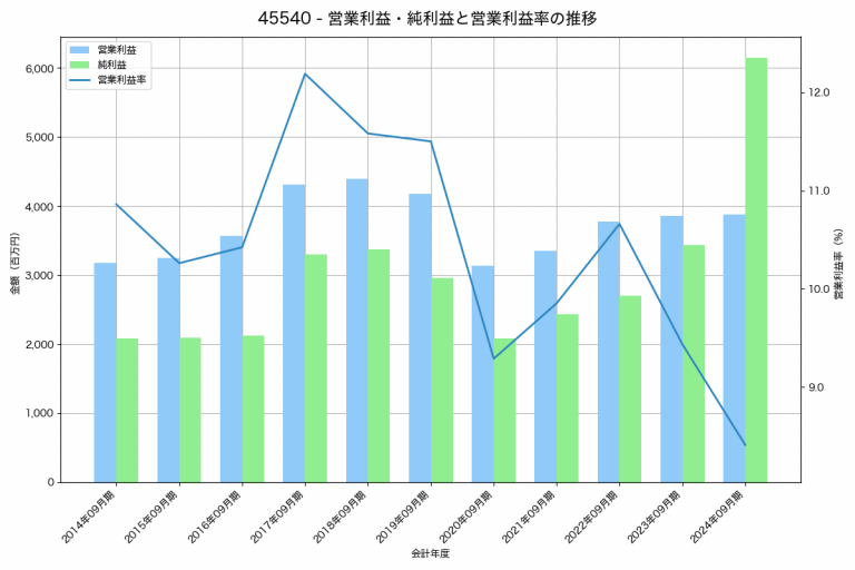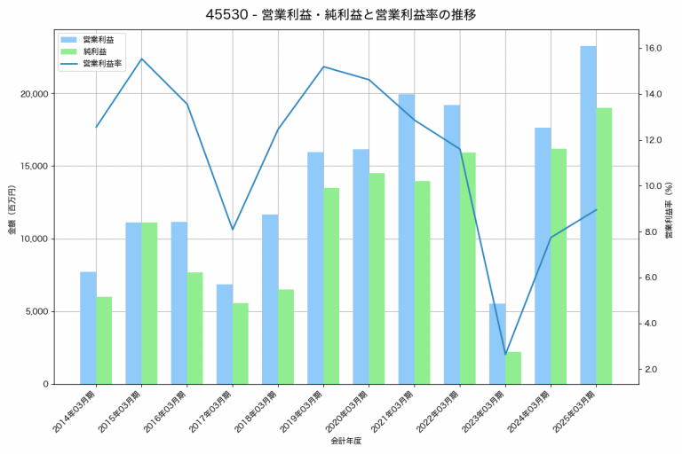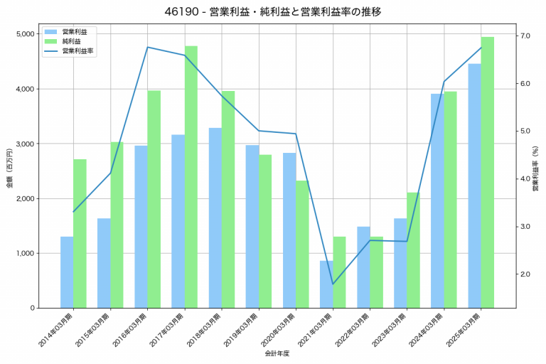 日本特殊塗料の2025年03月期の営業利益は4,456百万円、営業利益率は6.7%と前年比551百万円増、営業利益率は0.7%pt増です。