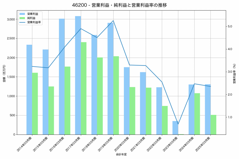 東和薬品の2025年03月期の営業利益は23,242百万円、営業利益率は9.0%と前年比5,595百万円増、営業利益率は1.2%pt増です。