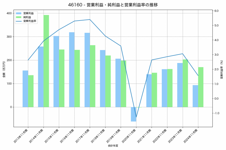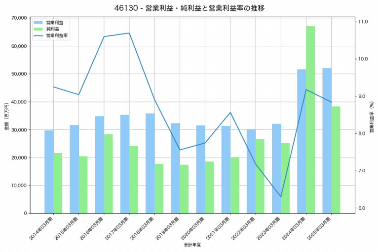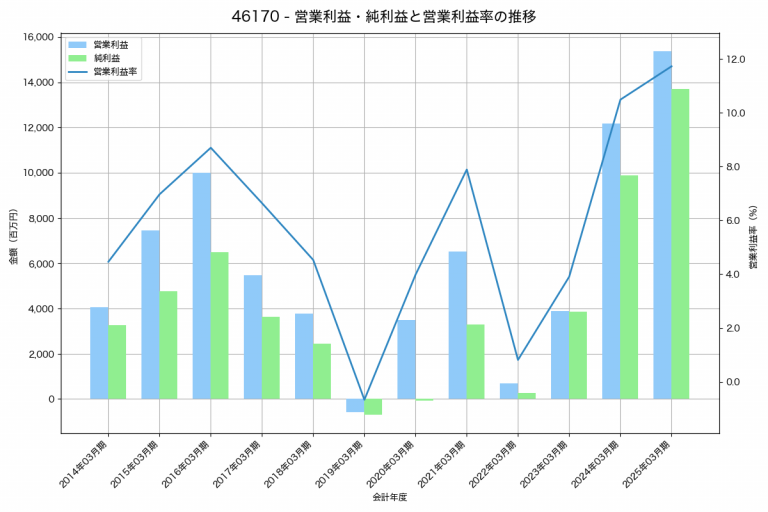 生化学工業の2025年03月期の営業利益は1,333百万円、営業利益率は3.4%と前年比900百万円増、営業利益率は2.2%pt増です。