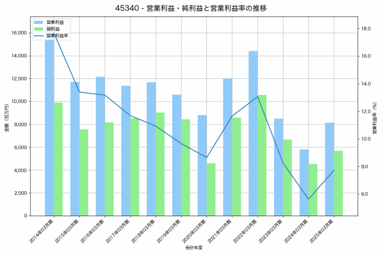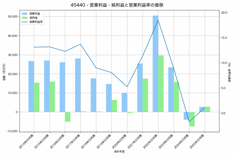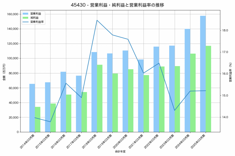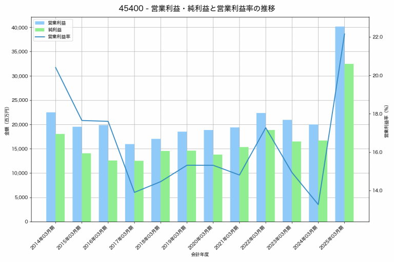 ツムラの2025年03月期の営業利益は40,125百万円、営業利益率は22.2%と前年比20,108百万円増、営業利益率は8.9%pt増です。