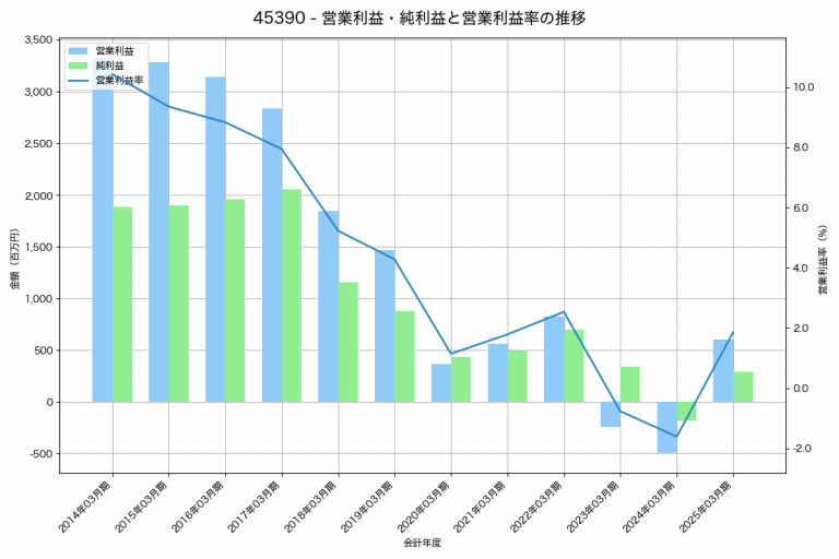 日本ケミファの2025年03月期の営業利益は606百万円、営業利益率は1.9%と前年比1,100百万円増、営業利益率は3.5%pt増です。