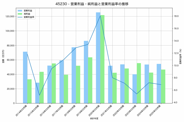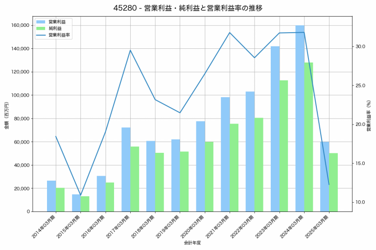 久光製薬の2025年02月期の営業利益は18,895百万円、営業利益率は12.1%と前年比5,728百万円増、営業利益率は2.8%pt増です。