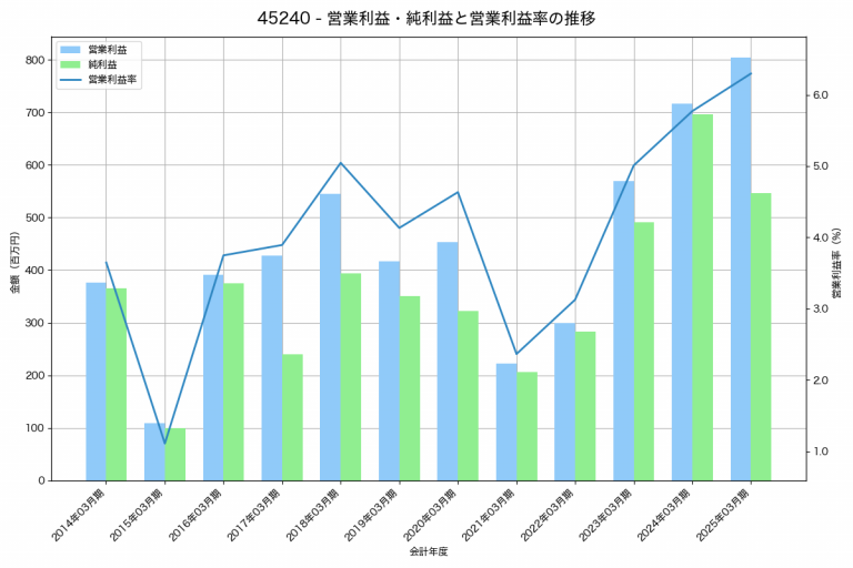 森下仁丹の2025年03月期の営業利益は804百万円、営業利益率は6.3%と前年比88百万円増、営業利益率は0.5%pt増です。