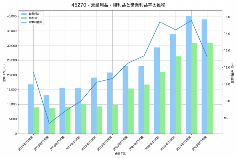 エーザイの2025年03月期の営業利益は54,378百万円、営業利益率は6.9%と前年比970百万円増、営業利益率は0.3%pt減です。